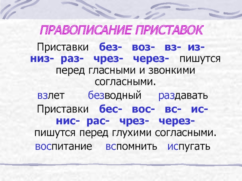 Приставки бес- вос- вс- ис- нис- рас- чрез- через- пишутся перед глухими согласными.