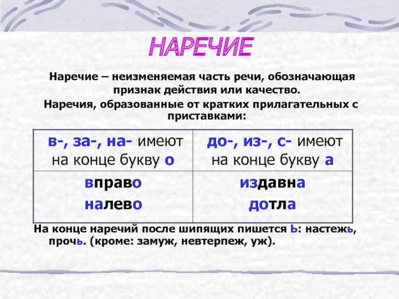 Наречие – неизменяемая часть речи, обозначающая признак действия или качество.