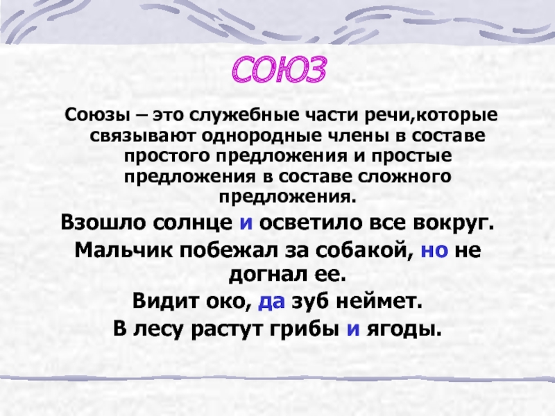 Союзы – это служебные части речи,которые связывают однородные члены в
