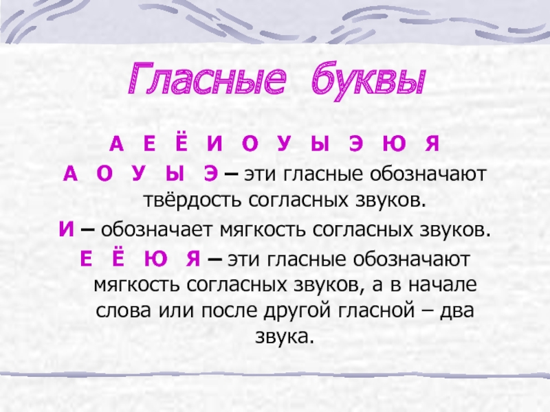 Е Ё Ю Я – эти гласные обозначают мягкость согласных звуков, а в начале слова или после другой гласной – два звука.