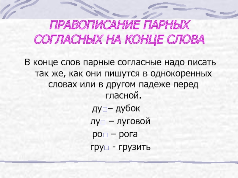 Слайд 6ПРАВОПИСАНИЕ ПАРНЫХ СОГЛАСНЫХ НА КОНЦЕ СЛОВА