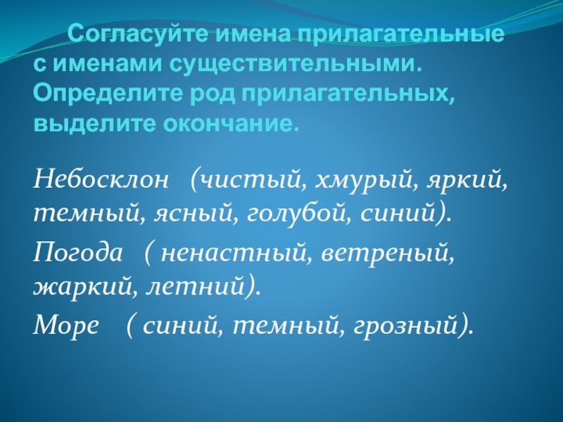 Небосклон (чистый, хмурый, яркий, темный, ясный, голубой, синий).
