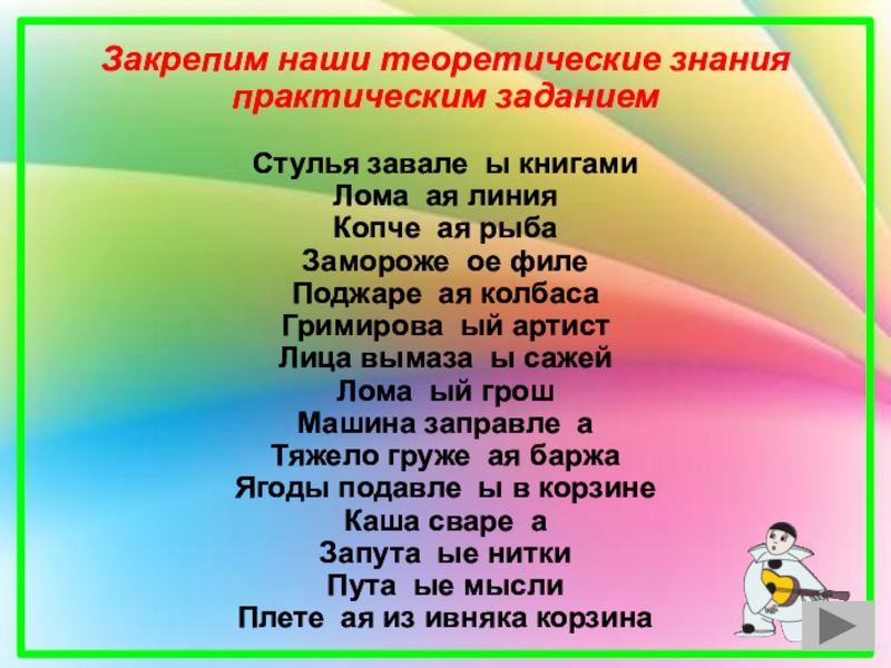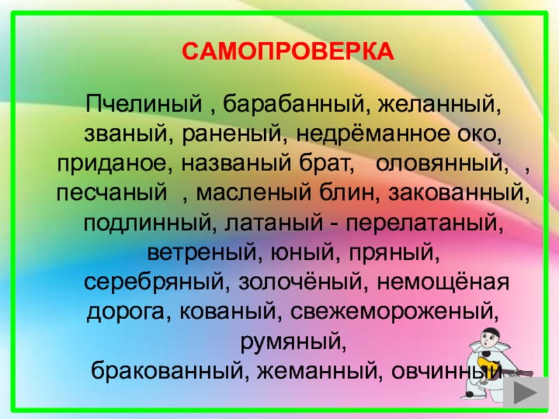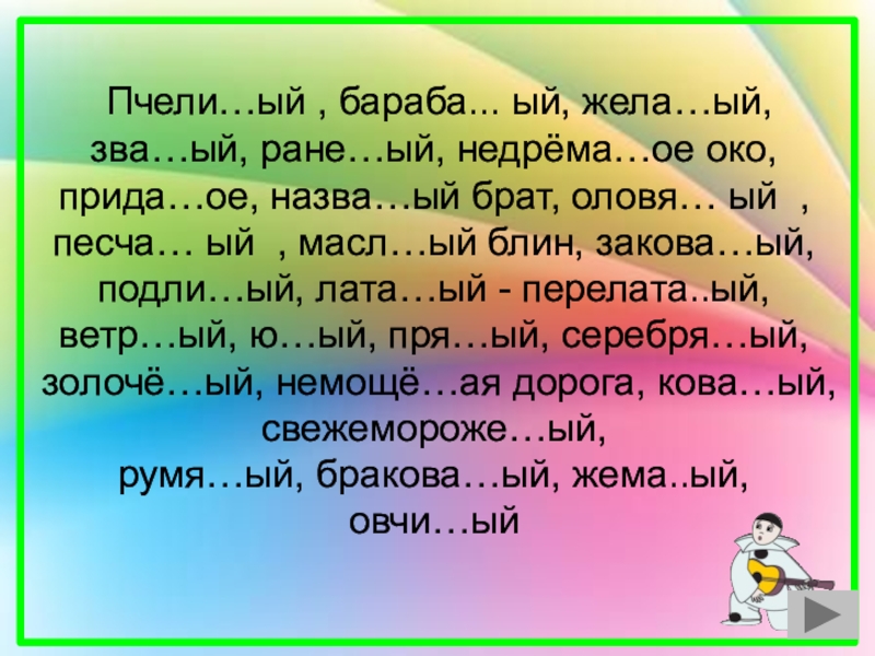 Каме…ый, лебеди…ый, песча…ый, серебр…ый, со…ый, соломе…ый, стекля…й, племе…ой, искустве…ый, пусты…й, румя…ый.