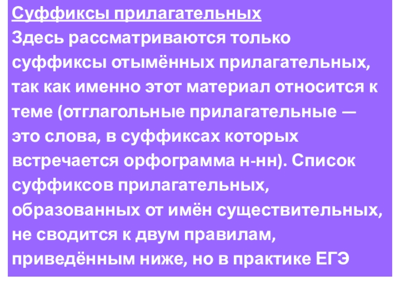 материал относится к теме (отглагольные прилагательные — это слова, в суффиксах которых встречается орфограмма н-нн). Список суффиксов прилагательных, образованных от имён существительных, не сводится к двум правилам, приведённым ниже, но в практике ЕГЭ использованы слова именно на эти правила.