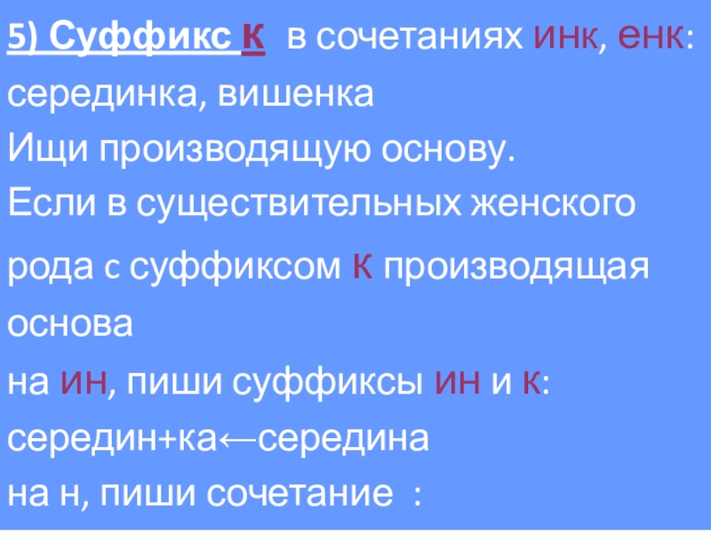 Слайд 335) Суффикс к в сочетаниях инк, енк: серединка, вишенка