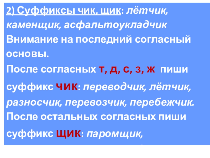 Слайд 242) Суффиксы чик, щик: лётчик, каменщик, асфальтоукладчик