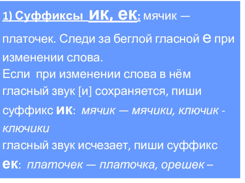 Слайд 271) Суффиксы ик, ек: мячик — платочек. Следи за беглой гласной