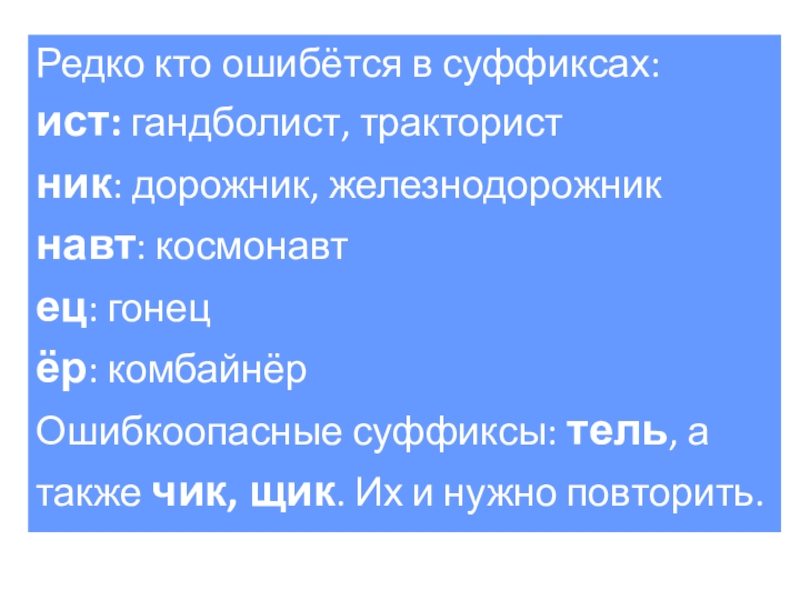 Ошибкоопасные суффиксы: тель, а также чик, щик. Их и нужно повторить.