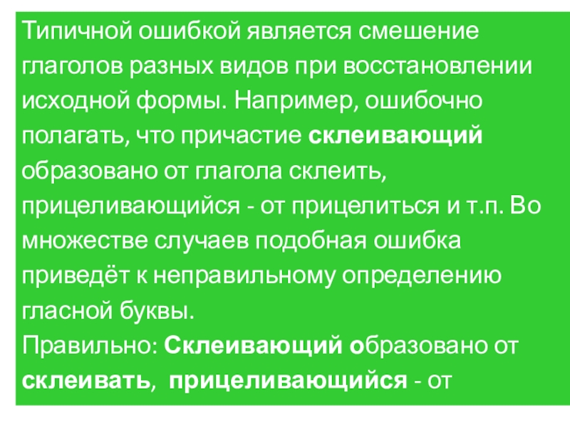 Слайд 17Типичной ошибкой является смешение глаголов разных видов при восстановлении исходной формы.