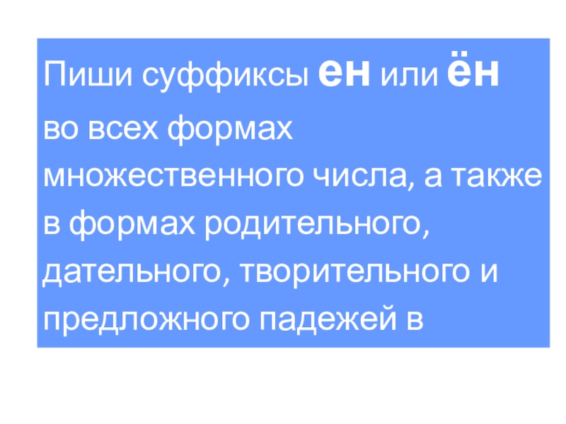 Слайд 35Пиши суффиксы ен или ён во всех формах множественного числа, а