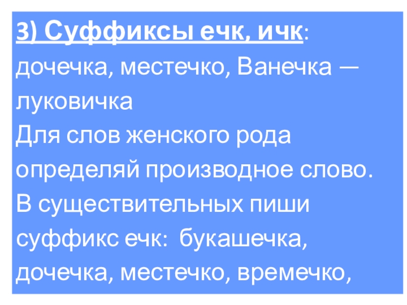 Слайд 303) Суффиксы ечк, ичк: дочечка, местечко, Ванечка — луковичка