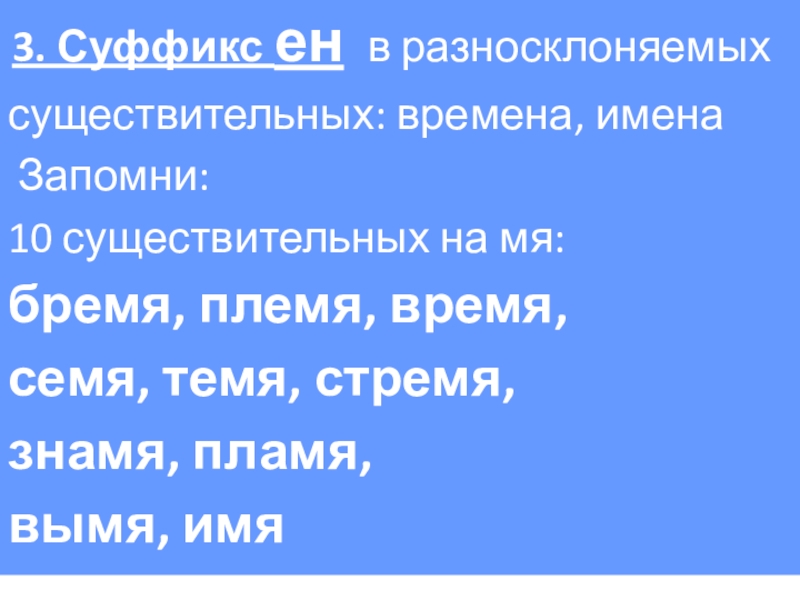 Слайд 34 3. Суффикс ен в разносклоняемых существительных: времена, имена
