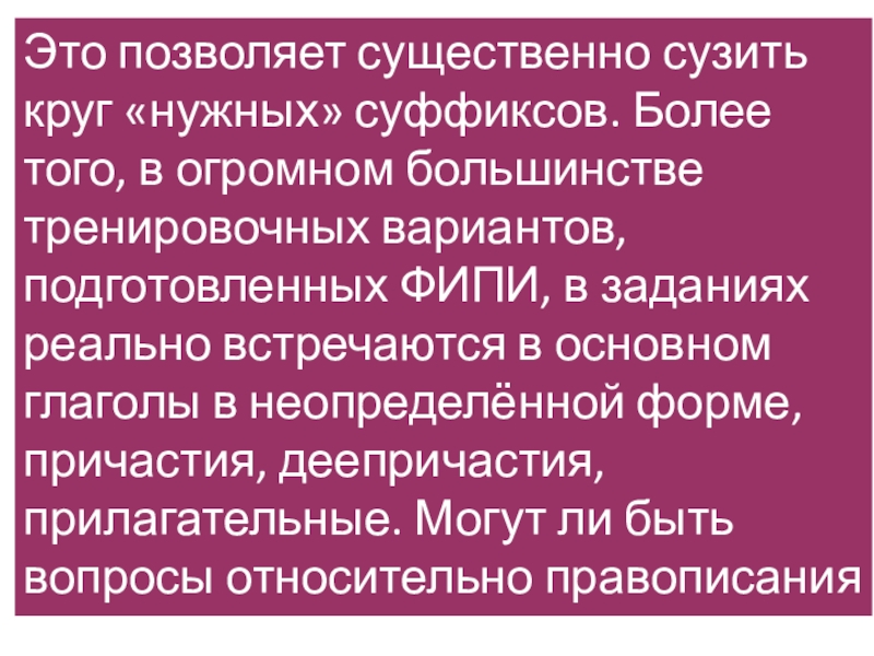 Слайд 4Это позволяет существенно сузить круг «нужных» суффиксов. Более того, в огромном