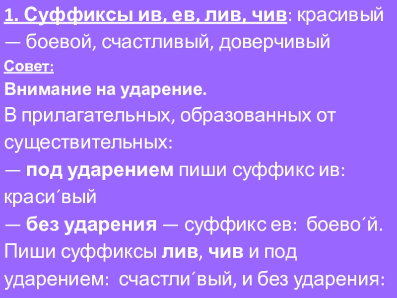 Слайд 191. Суффиксы ив, ев, лив, чив: красивый — боевой, счастливый, доверчивый