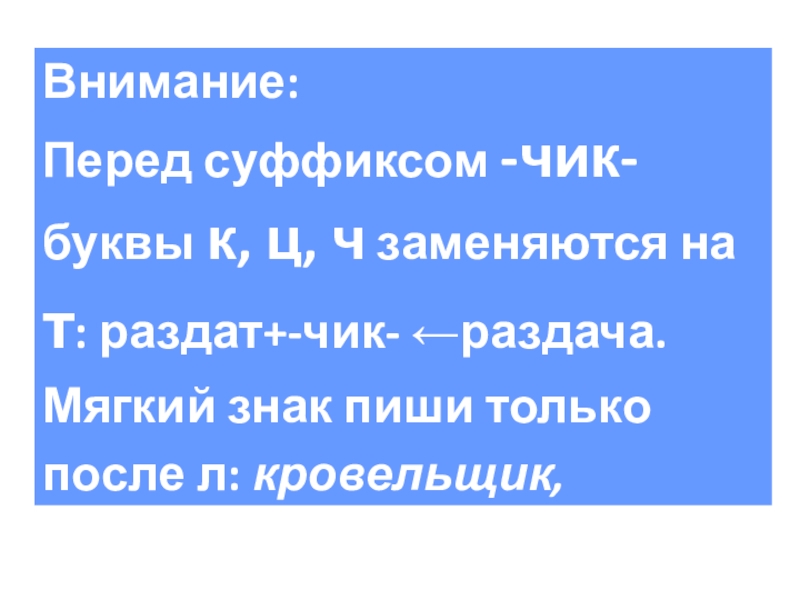 Перед суффиксом -чик- буквы к, ц, ч заменяются на т: раздат+-чик-