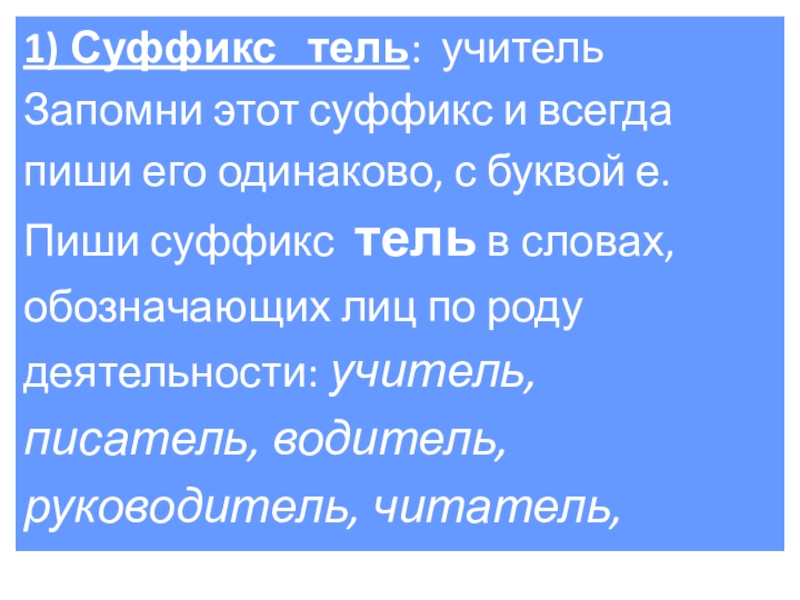 Пиши суффикс тель в словах, обозначающих лиц по роду деятельности: учитель, писатель, водитель, руководитель, читатель, зритель и др.