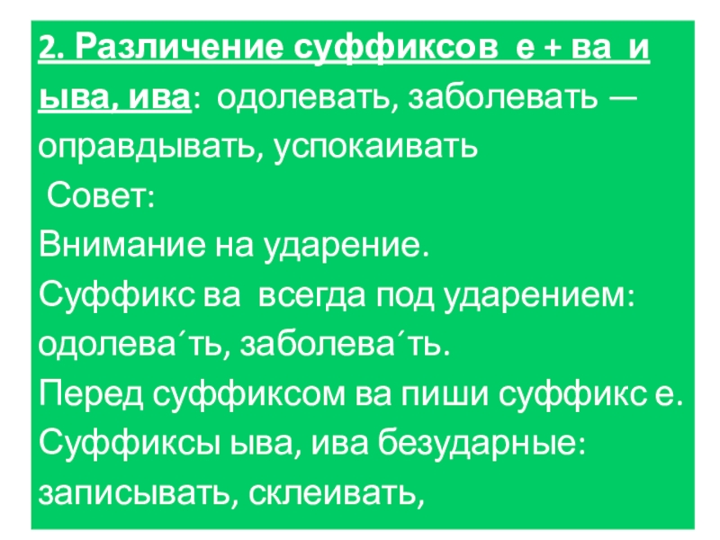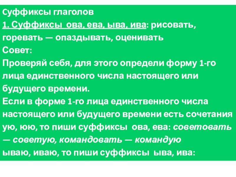 1. Суффиксы ова, ева, ыва, ива: рисовать, горевать — опаздывать,