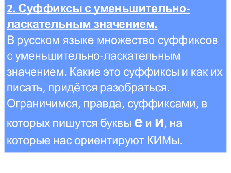 уменьшительно-ласкательным значением. Какие это суффиксы и как их писать, придётся разобраться. Ограничимся, правда, суффиксами, в которых пишутся буквы е и и, на которые нас ориентируют КИМы.
