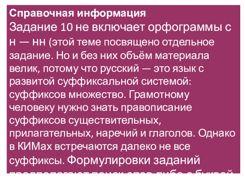 теме посвящено отдельное задание. Но и без них объём материала велик, потому что русский — это язык с развитой суффиксальной системой: суффиксов множество. Грамотному человеку нужно знать правописание суффиксов существительных, прилагательных, наречий и глаголов. Однако в КИМах встречаются далеко не все суффиксы. Формулировки заданий предполагают поиск слов либо с буквой е, либо с буквой и.