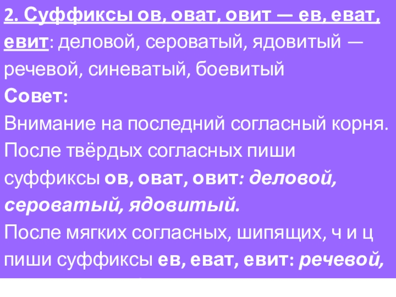 После твёрдых согласных пиши суффиксы ов, оват, овит: деловой, сероватый, ядовитый.