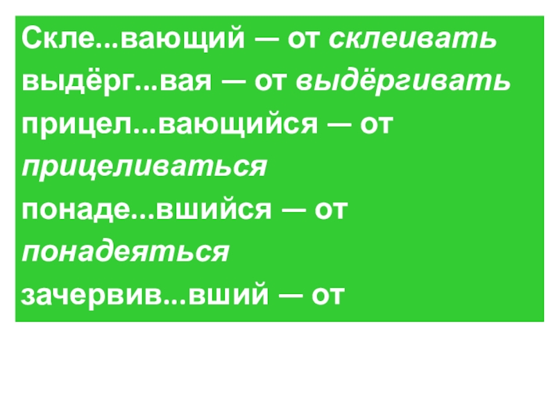 скле...вающий, выдёрг...вая, прицел...вающийся, понаде...вшийся, зачервив...вший, повизг...вая