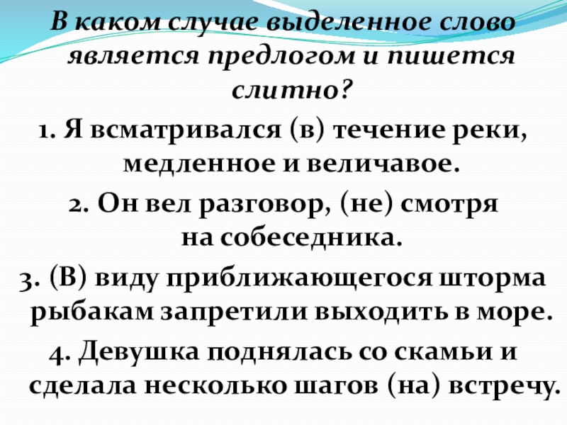 3. (В) виду приближающегося шторма рыбакам запретили выходить в море.