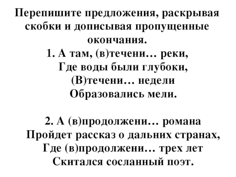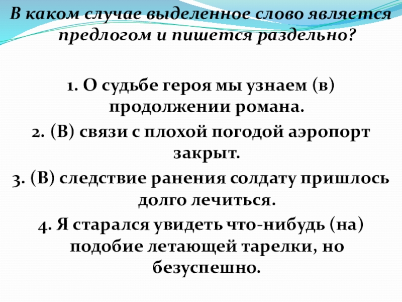 (В) течени... дня Хорь не раз заговаривал со мною (Т.). 2. (В) течени... военных событий произошли резкие изменения. 3. Иногда на базаре какая-нибудь барыня давала Ванюше свою корзину и платила ему пятак (за) то, что он (в) продолжени... часа таскал за ней по базару эту корзину (М. Г.). 4. О судьбе героев автор обещал рассказать (в) продолжени... романа. 5. (В) следстви... подчиненного положения Якова в пансионате товарищи обращались с ним небрежно (Г.). 6. (В) следстви... по делу арестованного вмешались представители общественных организаций. 7. (В) последстви... я узнал, что не только наводнение являлось причиной нашей задержки (Аре). 8. (В) течени...всей дороги Касьян сохранял упрямое молчание (Т.). 9. Она повторяла свою роль (на) ходу, низко кланялась и несколько раз потом качала головою (на) подоби... глиняных котов (П.). 10. (В) следстви... какой-то задержки в пути лошади отстали (Аре). 11. (В) продолжени... всего лета он раза два-три в неделю приезжал к нам (Л. Т.).