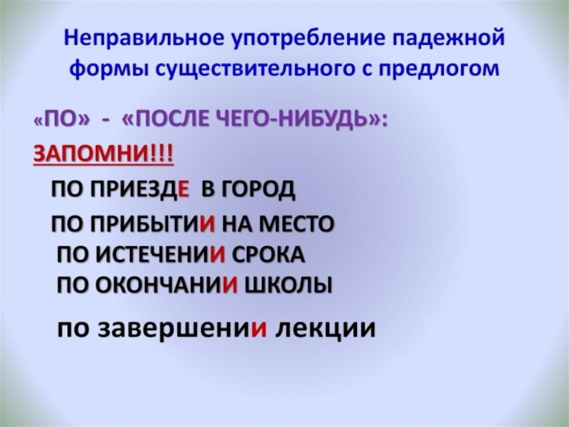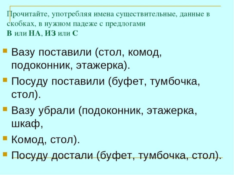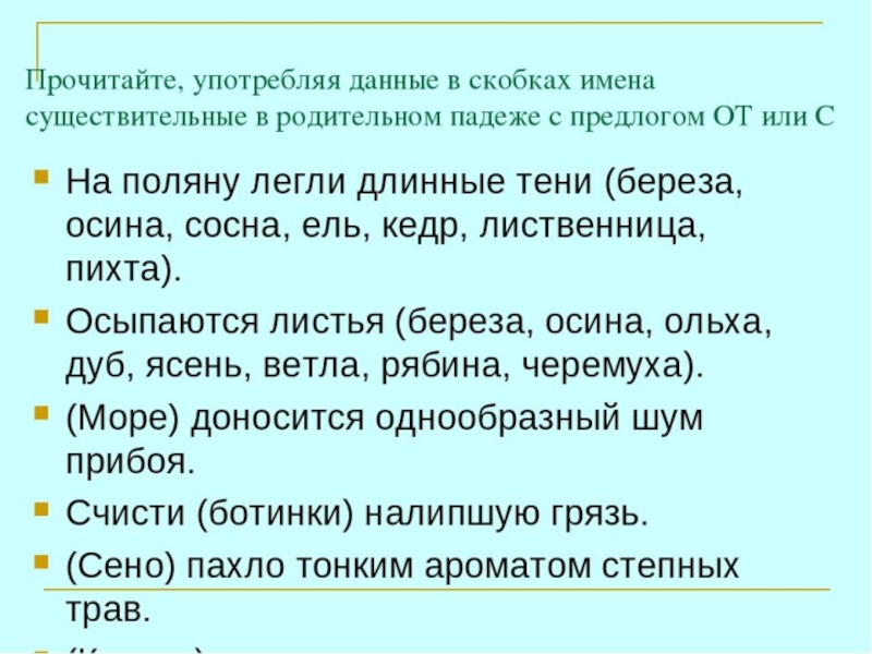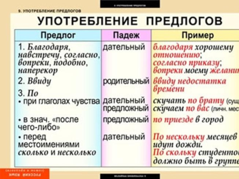 (желание) друзей, идти навстречу (ветер), действовать согласно (закон), вопреки (предсказание), благодаря (прочные знания), добиться успеха благодаря (серьезное отношение) к делу, по (сколько) книг вы получили, нам дали (несколько) тетрадей, выдали по (десять) рублей, по (приезд) в город устроился в гостинице, тосковал по (родное село), грустил по (вы), сделать доклад по (возвращение), приехать на стройку по (окончание) вуза, вопреки (совет) друзей, тужить по (он), действовать согласно (предписание), скучать по (сын).