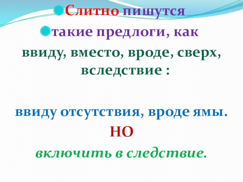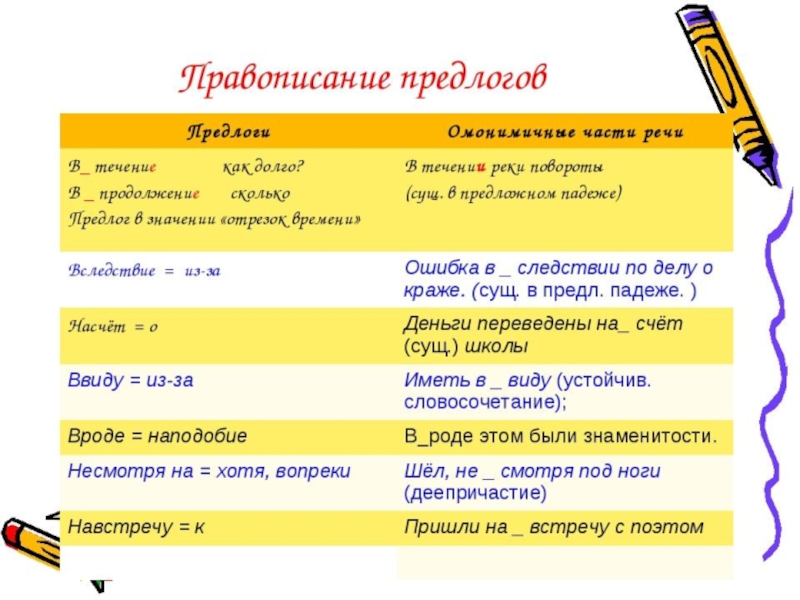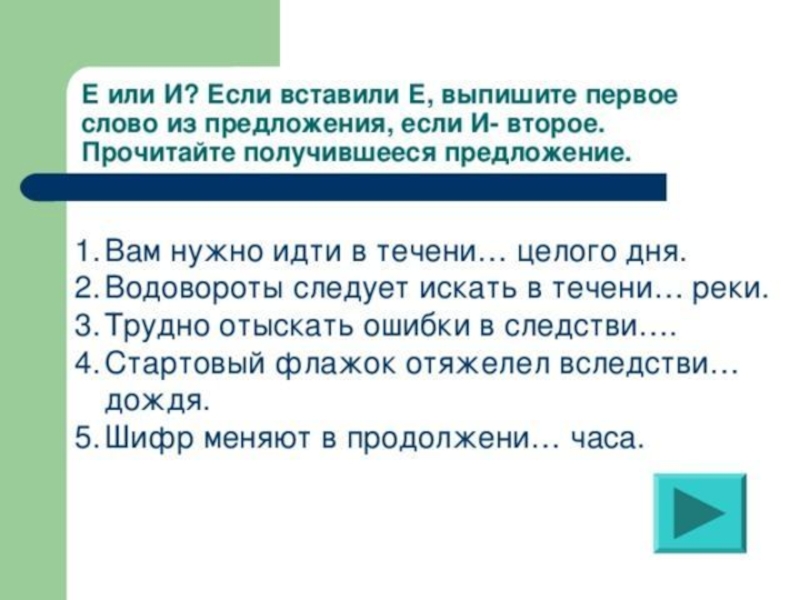 погода не изменится. В теченииболезни наступило улучшение. 2. В продолжение всей лекции слушатели были весьма внимательны. О дальнейшей судьбе героев автор собирается рассказать в продолжении повести. 3. В заключение собрания была принята резолюция. В заключении врачей указан метод дальнейшего лечения. 4. Вследствие плохой погоды экскурсия не состоялась. В следствии по уголовному делу использованы данные медицинской экспертизы. 5. Ввиду предстоящего скорого отъезда нужно поторопиться со сборами. Следует иметь в виду возможные изменения условий работы. 6. Получилось что-то вроде самодельного велосипеда. В роде Толстых было немало одаренных людей.