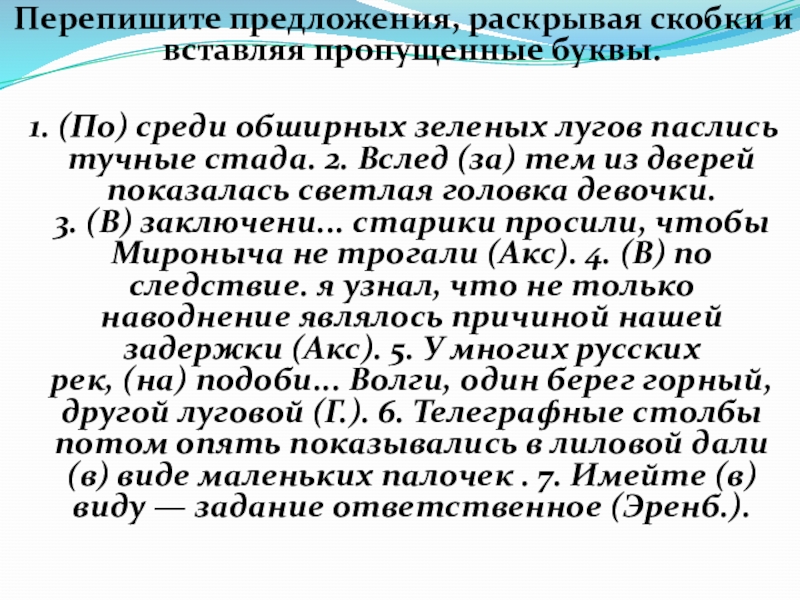 лугов паслись тучные стада. 2. Вслед (за) тем из дверей показалась светлая головка девочки. 3. (В) заключени... старики просили, чтобы Мироныча не трогали (Акс). 4. (В) последствие. я узнал, что не только наводнение являлось причиной нашей задержки (Акс). 5. У многих русских рек, (на) подоби... Волги, один берег горный, другой луговой (Г.). 6. Телеграфные столбы потом опять показывались в лиловой дали (в) виде маленьких палочек . 7. Имейте (в) виду — задание ответственное (Эренб.).