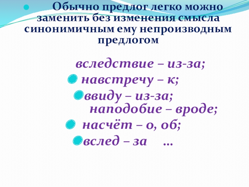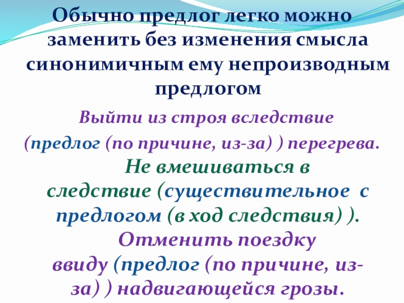 Слайд 34Обычно предлог легко можно заменить без изменения смысла