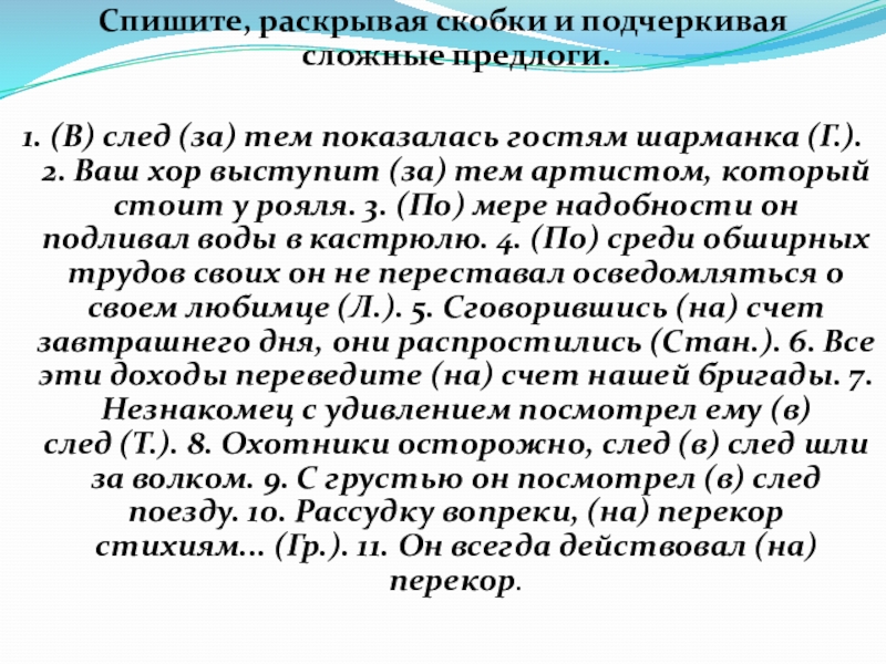 гостям шарманка (Г.). 2. Ваш хор выступит (за) тем артистом, который стоит у рояля. 3. (По) мере надобности он подливал воды в кастрюлю. 4. (По) среди обширных трудов своих он не переставал осведомляться о своем любимце (Л.). 5. Сговорившись (на) счет завтрашнего дня, они распростились (Стан.). 6. Все эти доходы переведите (на) счет нашей бригады. 7. Незнакомец с удивлением посмотрел ему (в) след (Т.). 8. Охотники осторожно, след (в) след шли за волком. 9. С грустью он посмотрел (в) след поезду. 10. Рассудку вопреки, (на) перекор стихиям... (Гр.). 11. Он всегда действовал (на) перекор.