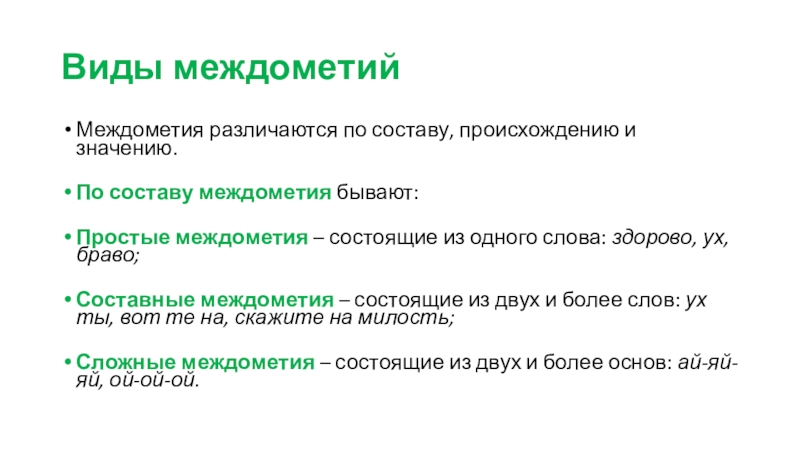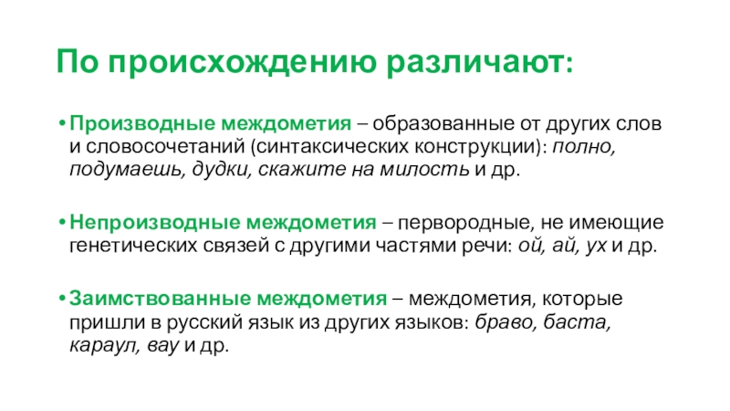 Непроизводные междометия – первородные, не имеющие генетических связей с другими частями речи: ой, ай, ух и др.