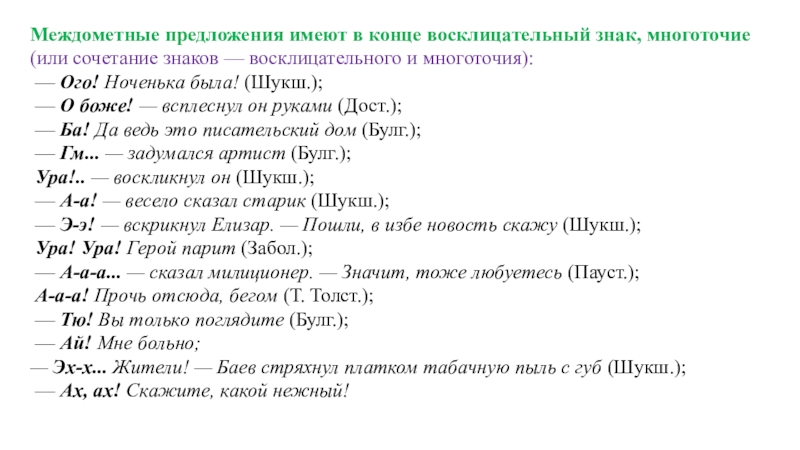 Слайд 16Междометные предложения имеют в конце восклицательный знак, многоточие (или сочетание знаков