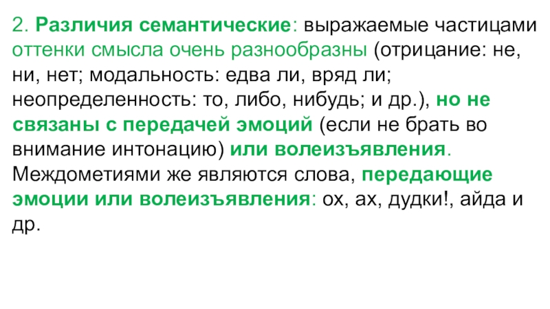 Слайд 152. Различия семантические: выражаемые частицами оттенки смысла очень разнообразны (отрицание: не,