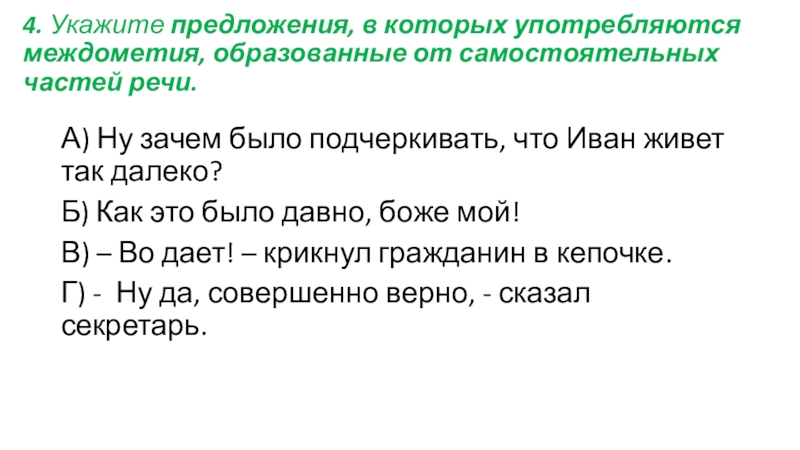 Слайд 294. Укажите предложения, в которых употребляются междометия, образованные от самостоятельных частей речи.