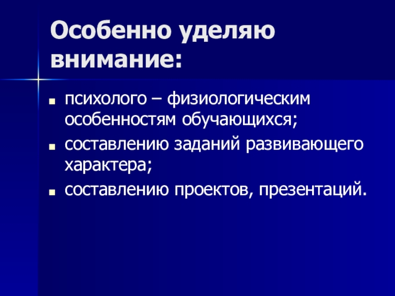 Особенно уделяю внимание: психолого – физиологическим особенностям обучающихся;составлению заданий развивающего характера;составлению проектов, презентаций.