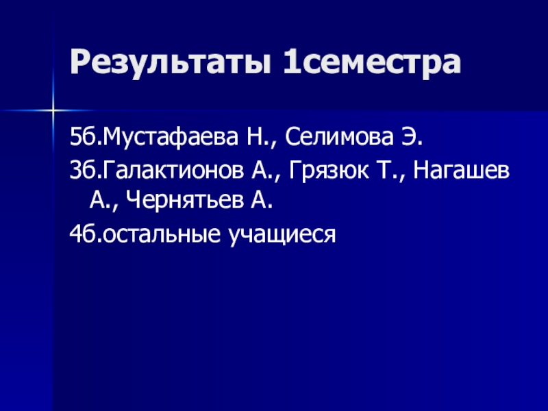 Результаты 1семестра 5б.Мустафаева Н., Селимова Э.3б.Галактионов А., Грязюк Т., Нагашев А., Чернятьев А.4б.остальные учащиеся