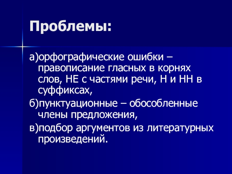 Проблемы:а)орфографические ошибки – правописание гласных в корнях слов, НЕ с частями речи, Н и НН в суффиксах,б)пунктуационные