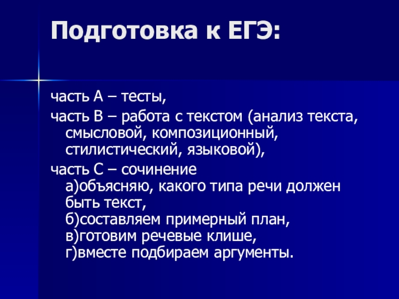 Подготовка к ЕГЭ: часть А – тесты,часть В – работа с текстом (анализ текста, смысловой, композиционный, стилистический,