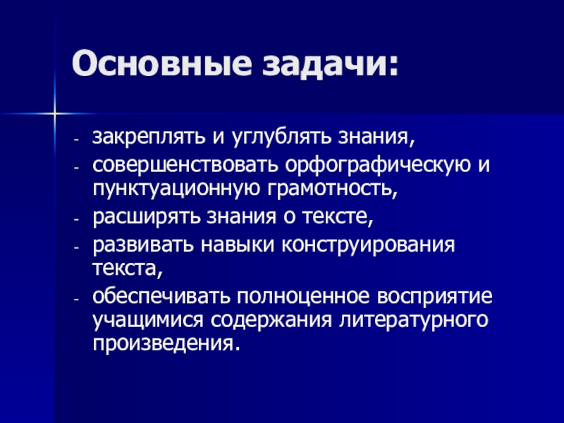 Основные задачи:закреплять и углублять знания,совершенствовать орфографическую и пунктуационную грамотность,расширять знания о тексте,развивать навыки конструирования текста,обеспечивать полноценное восприятие