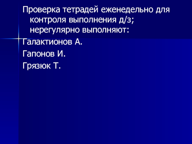 Проверка тетрадей еженедельно для контроля выполнения д/з; нерегулярно выполняют: Галактионов А.Гапонов И.Грязюк Т.