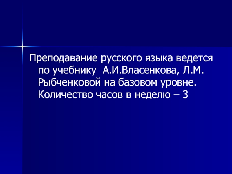 Слайд 3Преподавание русского языка ведется по учебнику А.И.Власенкова, Л.М.Рыбченковой на базовом уровне.