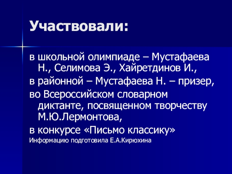 Участвовали:в школьной олимпиаде – Мустафаева Н., Селимова Э., Хайретдинов И.,в районной – Мустафаева Н. – призер,во Всероссийском
