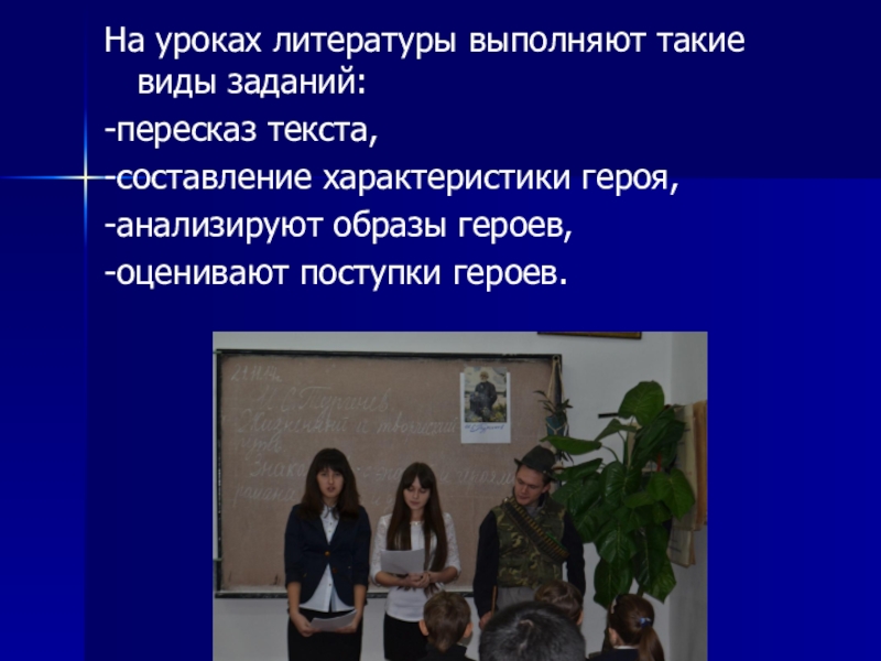 На уроках литературы выполняют такие виды заданий:-пересказ текста, -составление характеристики героя,-анализируют образы героев,-оценивают поступки героев.