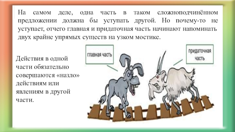 Действия в одной части обязательно совершаются «назло» действиям или явлениям в другой части.