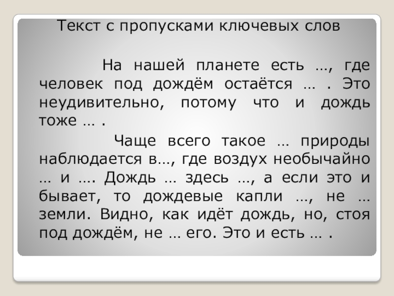На нашей планете есть …, где человек под дождём остаётся … . Это неудивительно, потому что и дождь тоже … .