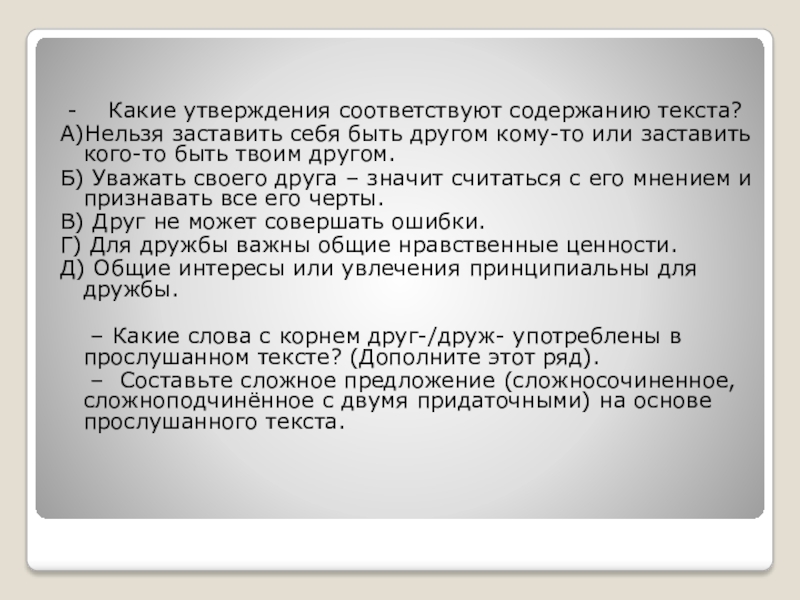 – Составьте сложное предложение (сложносочиненное, сложноподчинённое с двумя придаточными) на основе прослушанного текста.