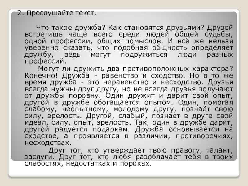 такое дружба? Как становятся друзьями? Друзей встретишь чаще всего среди людей (…) судьбы, одной профессии, (…) помыслов. И всё же нельзя уверенно сказать, что (…) общность определяет дружбу, ведь могут подружиться люди (…) профессий.