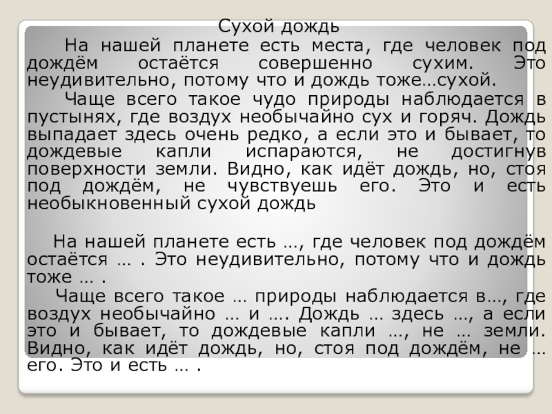 Чаще всего такое … природы наблюдается в…, где воздух необычайно … и …. Дождь … здесь …, а если это и бывает, то дождевые капли …, не … земли. Видно, как идёт дождь, но, стоя под дождём, не … его. Это и есть … .